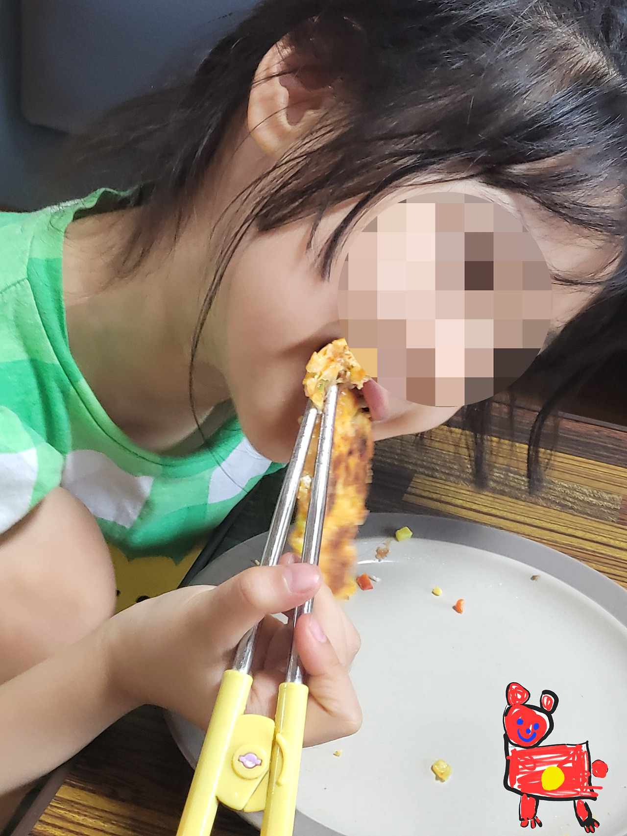 아이는 행복하게 쩝쩝거리며 먹는다.