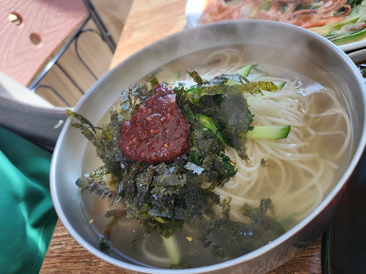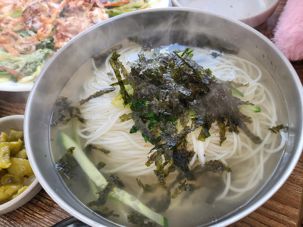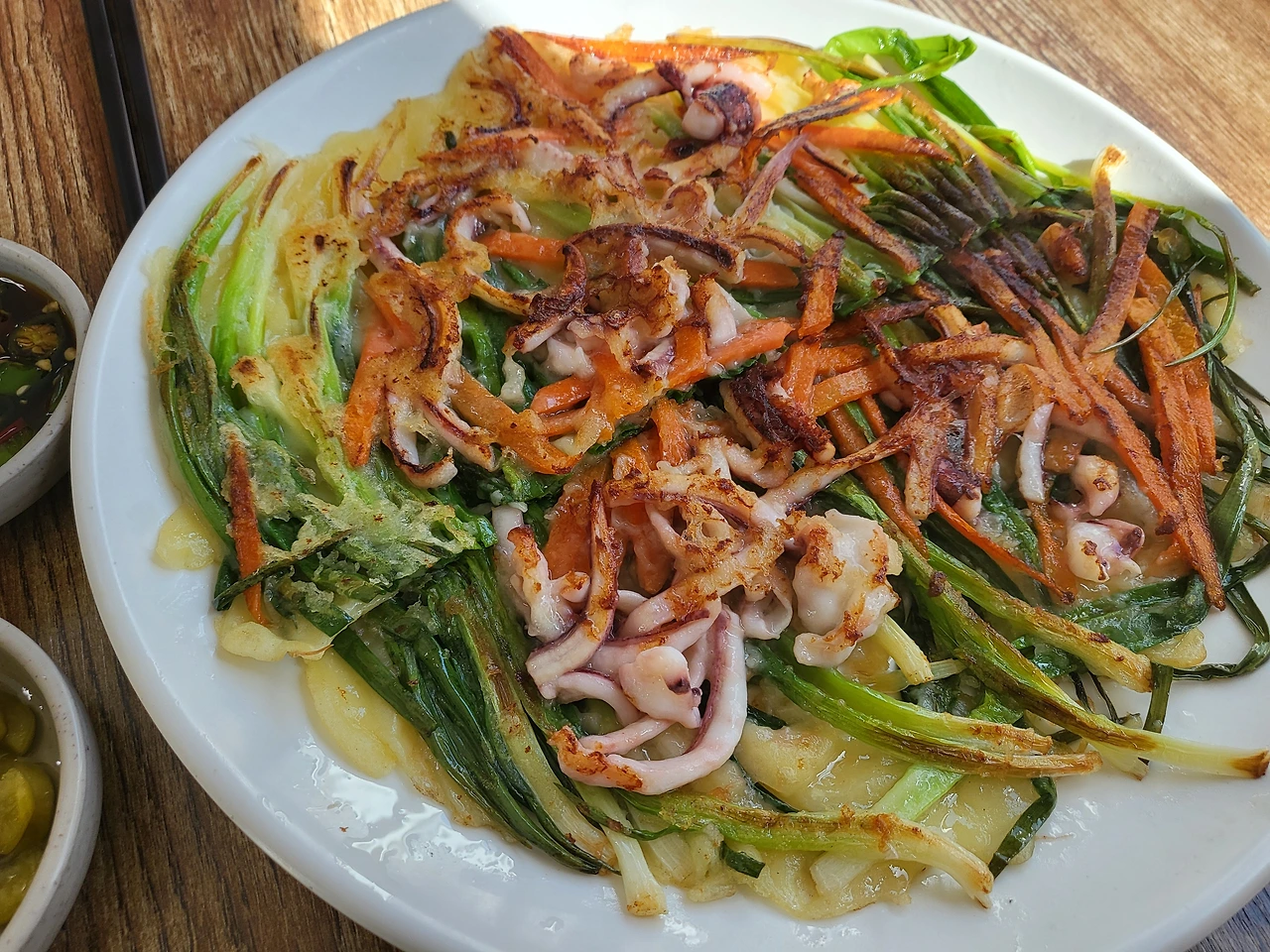 기본 국수 양이 제법 많아요 곱배기가 따로 없어요 파전에 오징어가 가득^^