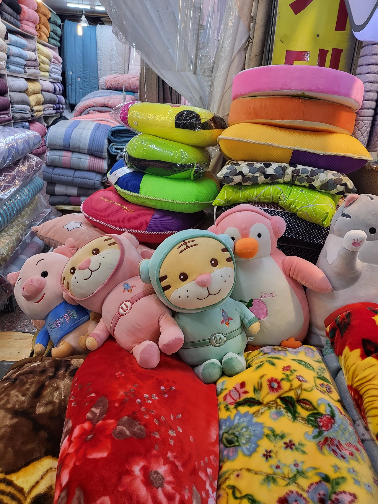 아이가 좋아했던 호비를 닮은 인형이 보여.. ㅎㅎ 시장에서만 파는 화려한 색감의 이불도 간만에 구경했어요