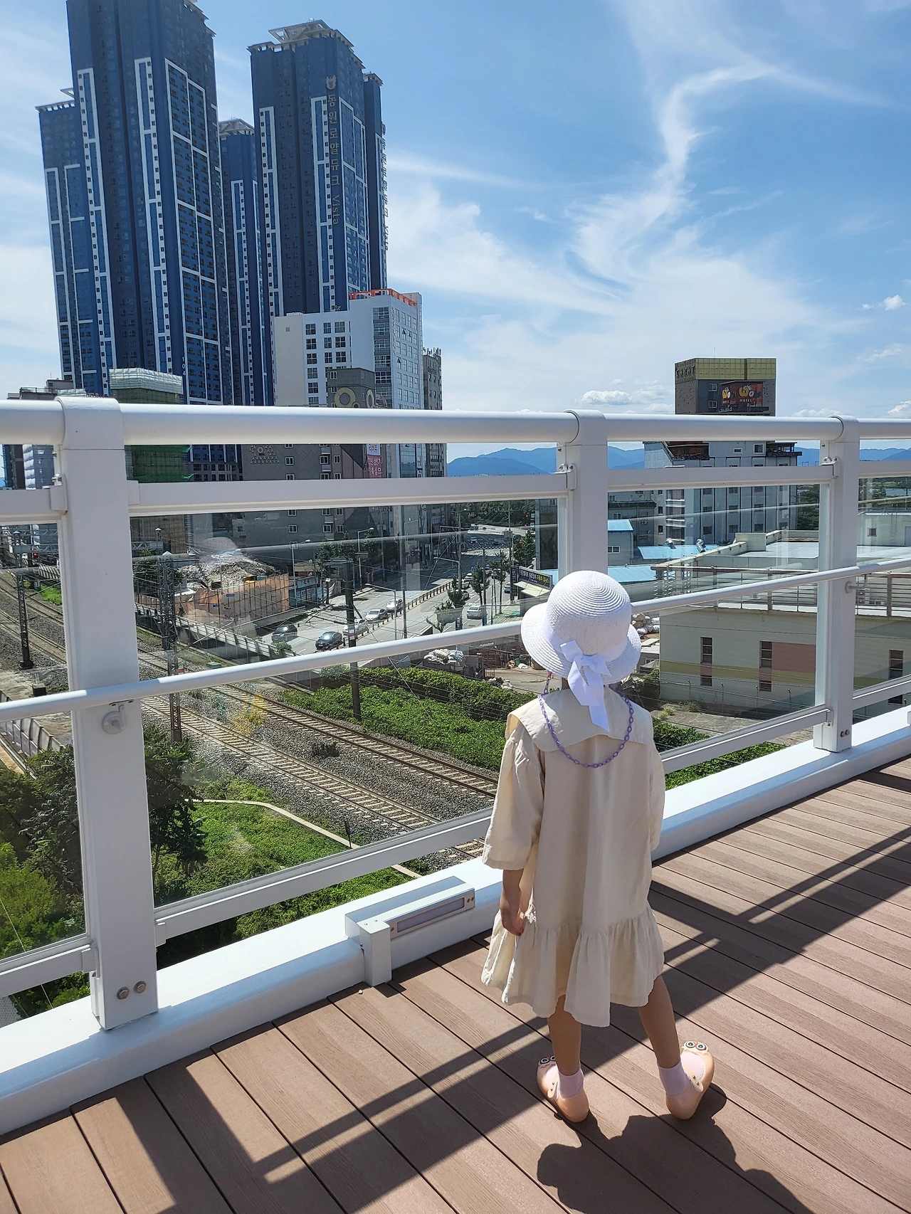 아이와 함께 엘리베이터를 타고 오르면 구포역을 지나는 기찻길과 기차들을 구경할 수 있고 강변 공원까지 이어지는 전망대에 다다른다.
