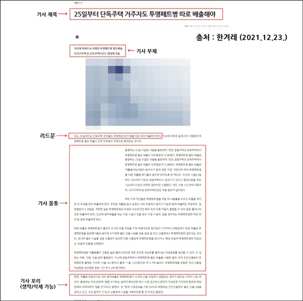 단독주택 투명페트병 별도 배출에 관한 한겨레 2021년 12월 23일자 기사. (출처 : 한겨레 화면 캡쳐)