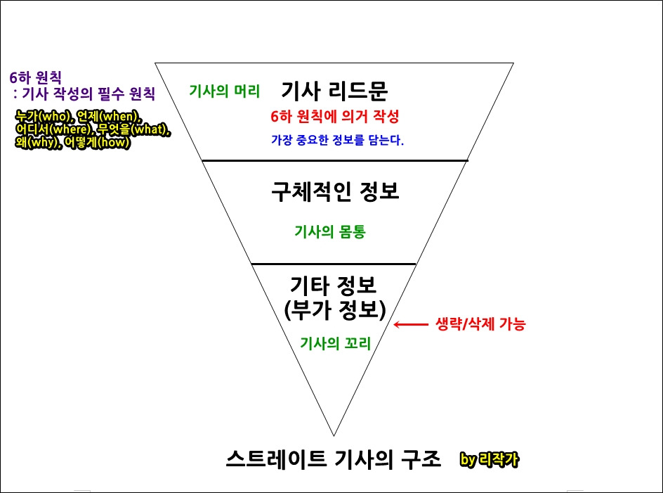 ○ 스트레이트 기사는 역삼각형 형태로 표제(headline), 전문(lead), 본문(body), 꼬리(보충사실) 등의 순서로 글을 쓴다. 특정한 사건 또는 현상의 개요를 즉시 파악할 수 있는 기사형식이다. 기사의 구조는 역피라미드(역삼각) 형식이다.