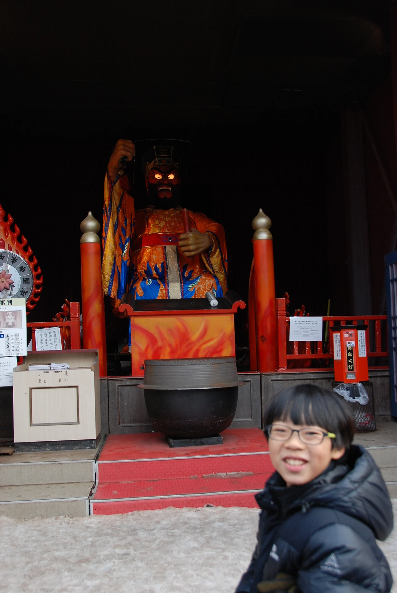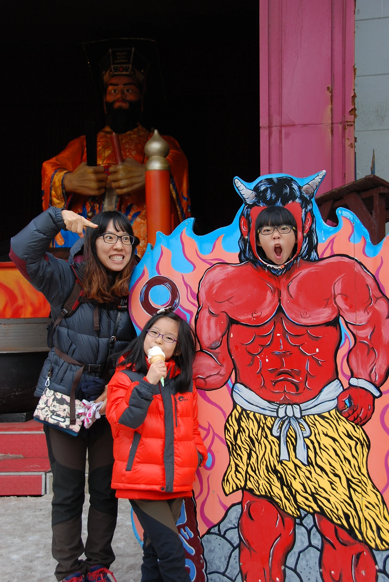 지옥온천에서 꼭 봐야 하는 것이 하나 있다. 정해진 시간마다 옥황상제 가면쇼를 하는데 꽤 유명한 듯 시간이 가까워지자 어디서 나타났는지 사람들이 구름 떼처럼 모여들었다. 옥황상제가 눈에 불을 켜고 순식간에 얼굴 형상을 바꾸는 가면극이었다. 괴성을 내며 가면을 바꿀 때마다 여기저기서 환호성이 터졌고 빨간 눈을 한 옥황상제 웃음소리에 어린 아이들은 겁에 질려 일제히 울음을 터뜨렸다. 나는 옥황상제 쇼보다 노보리베츠 계곡에 쩌렁쩌렁 울려 퍼지는 아이들 울음소리가 더 놀랍고 재미있었다.
