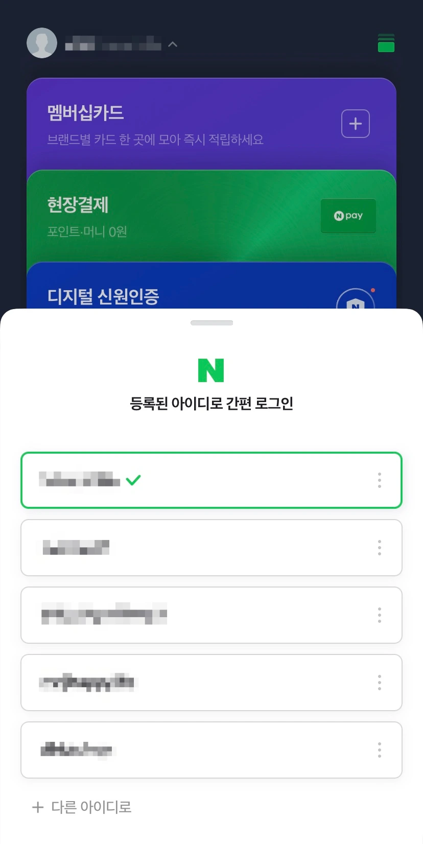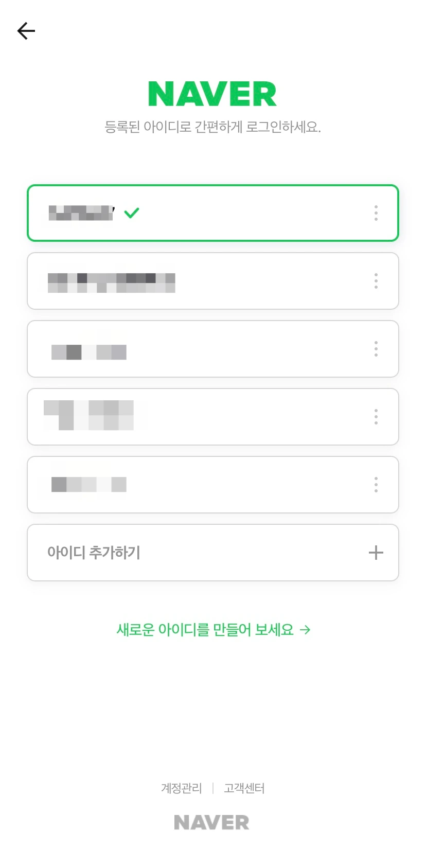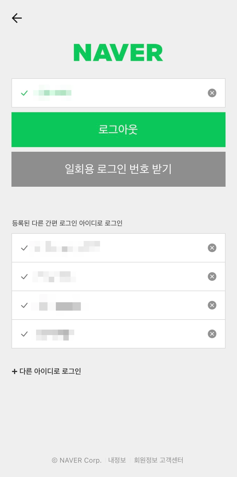 네이버 앱은 등록된 아이디로 간편하게 로그인이 가능하다. 로그아웃없이도 빠르게 아이디를 바꿀 수 있다. 단 등록은 최대 5개까지이다.