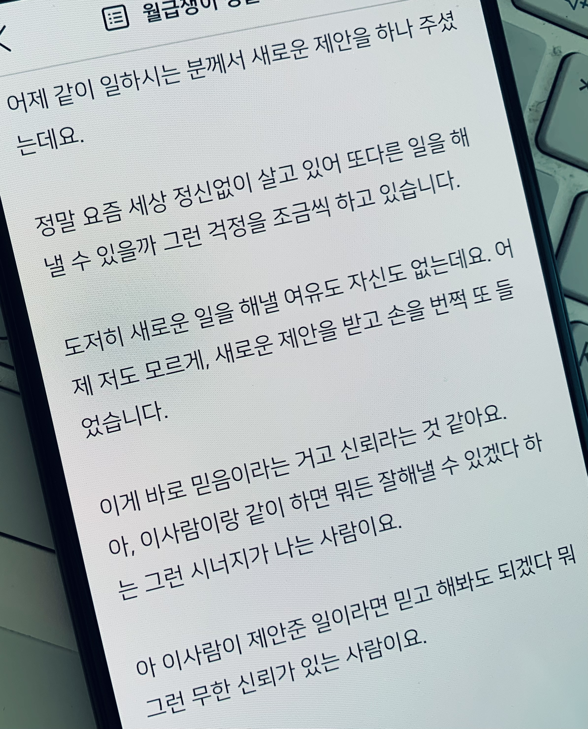 그들을 보면서 어떻게 내가 이 멋진 프로젝트에 참여할 수 있게 되었지? 스스로 뿌듯함이 밀려온다. 직장인 A 씨는 마케팅 대행사 대표님께 물어본 적이 있다. 왜 나에게 기회를 주었는지 말이다.
