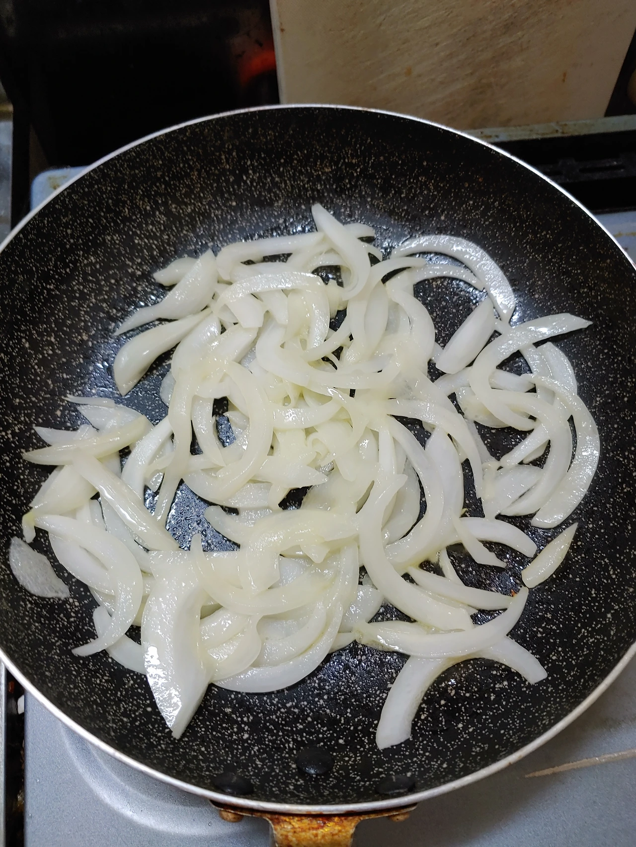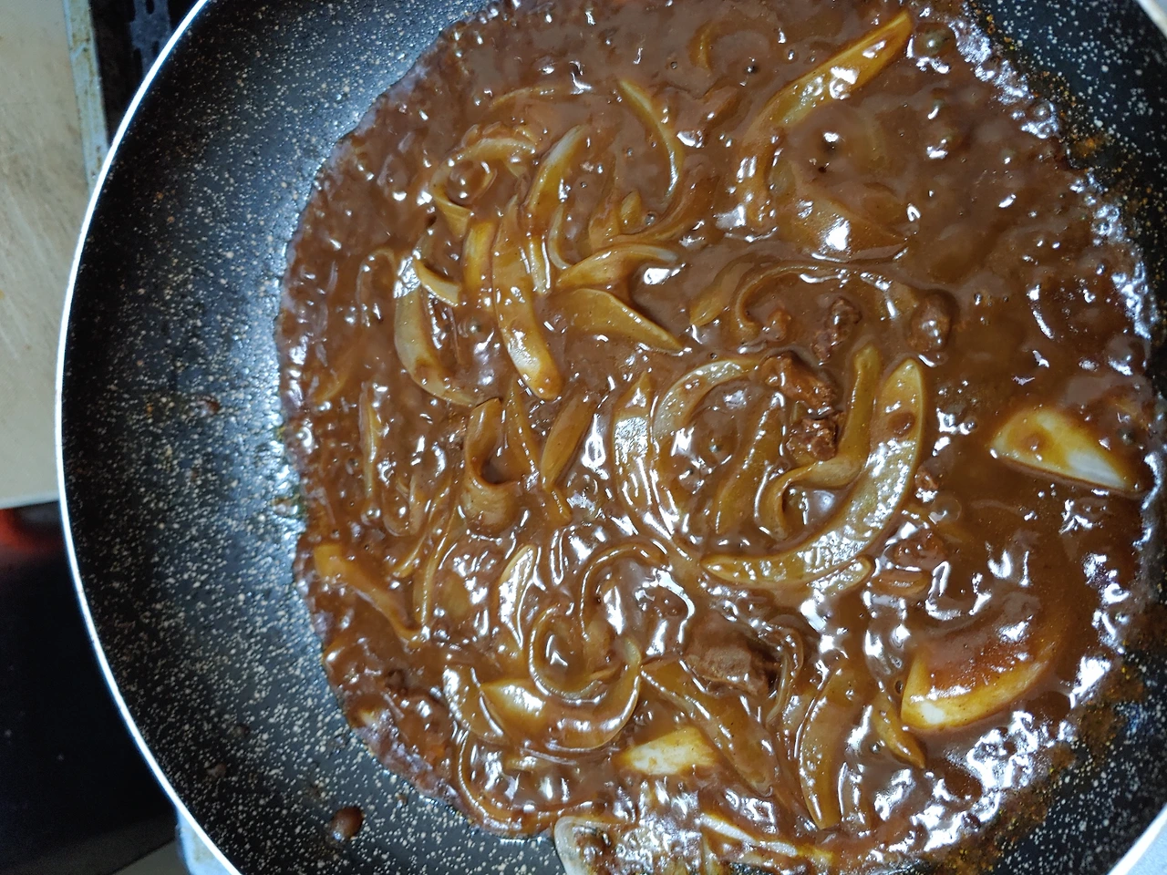 "양파가 노릇해지만 인스턴터 카레를 넣어서 따뜻해지면 끝이에요"