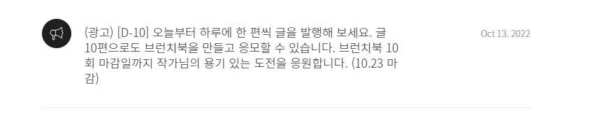 이렇게 급하게 브런치북을 만들 게 된 데는 이유가 있다. 바로 제10회 브런치북 출판 프로젝트(10월 23일 마감 예정이었다가, 10월 30일 마감으로 변경)에 응모해보기 위해서이다. 10월 13일 브런치로부터 공지 메시지가 왔다. 브런치북 출판 프로젝트 응모 마감이 10일 남았으니 하루에 한 편씩 써서 지원해보라는 것이다.