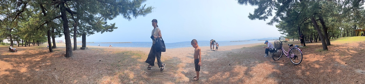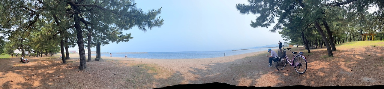 달리기는 보통 집 근처 2.5km를 빙글빙글 돈다. 오늘은 휴일이라 오랜만에 근처 바닷가 공원까지 달려보았다. 6km, 생각보다 짧았다. 7km는 될 줄 알았는데 6km만 달리니 바다가 훤히 보이는 공원. 오랜만에 와 보니 마치 관광지로 여행온 기분이었다. 바다, 모래사장, 소나무 숲, 부자, 모녀, 가족, 독서하는 할아버지...가 조용히 균형 있게 펼쳐져있다. 풍경을 사진에 담아보고 싶어 파노라마 모드를 가동했다. 찍기 시작하니 한 가족인 담긴다. 다시 경치만 담아보았다.