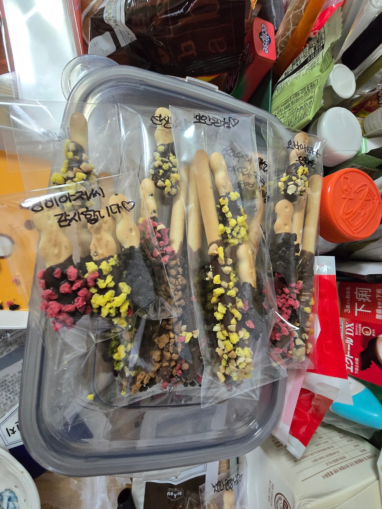 보람이가 엄마에게 도움을 청했다. 미리 주문한 재료로 어제 퇴근한 엄마와 함께 빼빼로를 직접 만들었다. 엄마와 함께 해서 그런지 내가 보기엔 꽤 먹음직스럽다. 열심히 만들어 두세 개씩 봉투에 담았다. 선물하고 싶은 사람들이 많다.