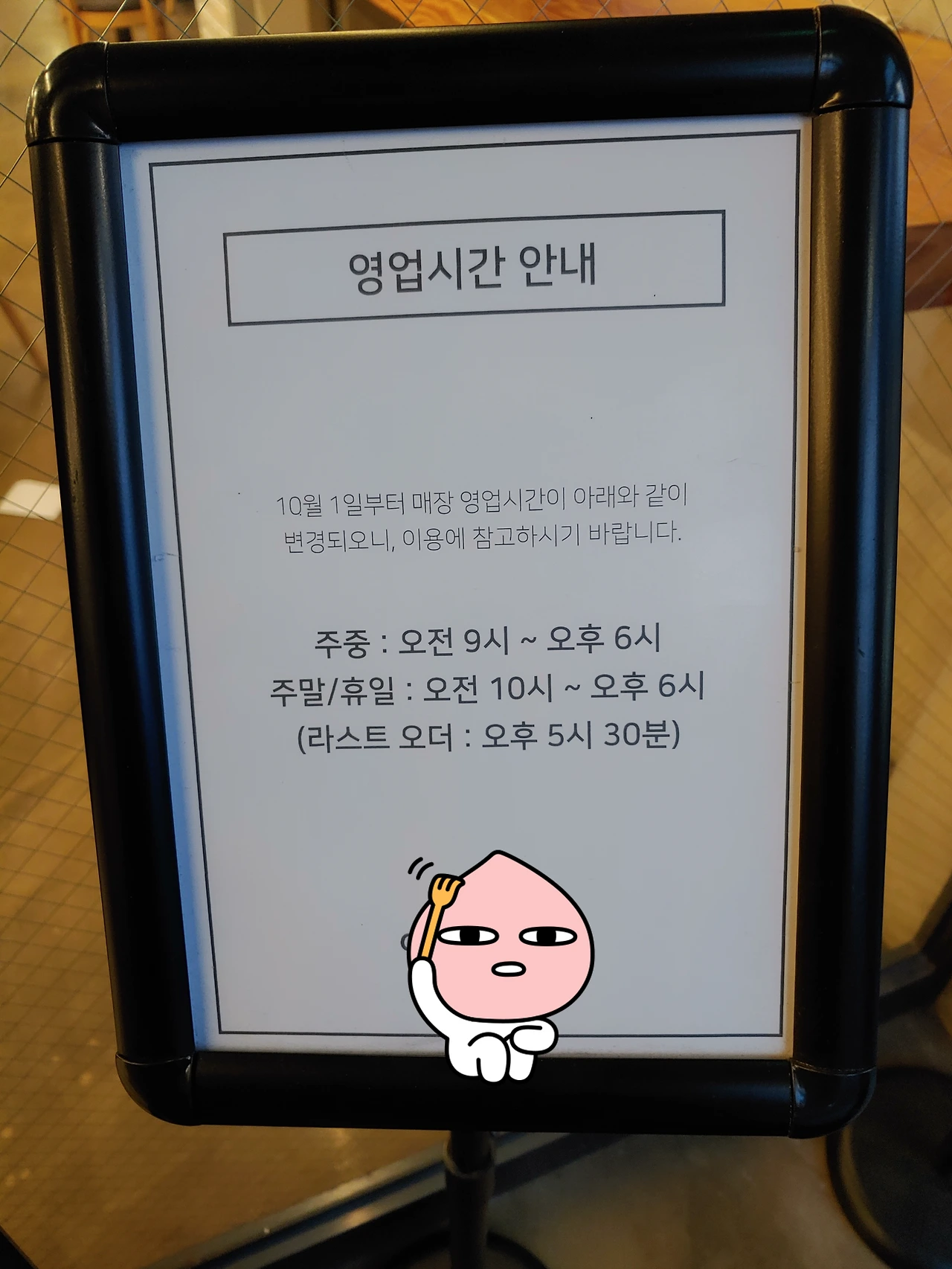 그리고 출입문이 두 개인데 그 사이에는 아래처럼 영업시간이 6까지라는 팻말이 서 있긴 했다.