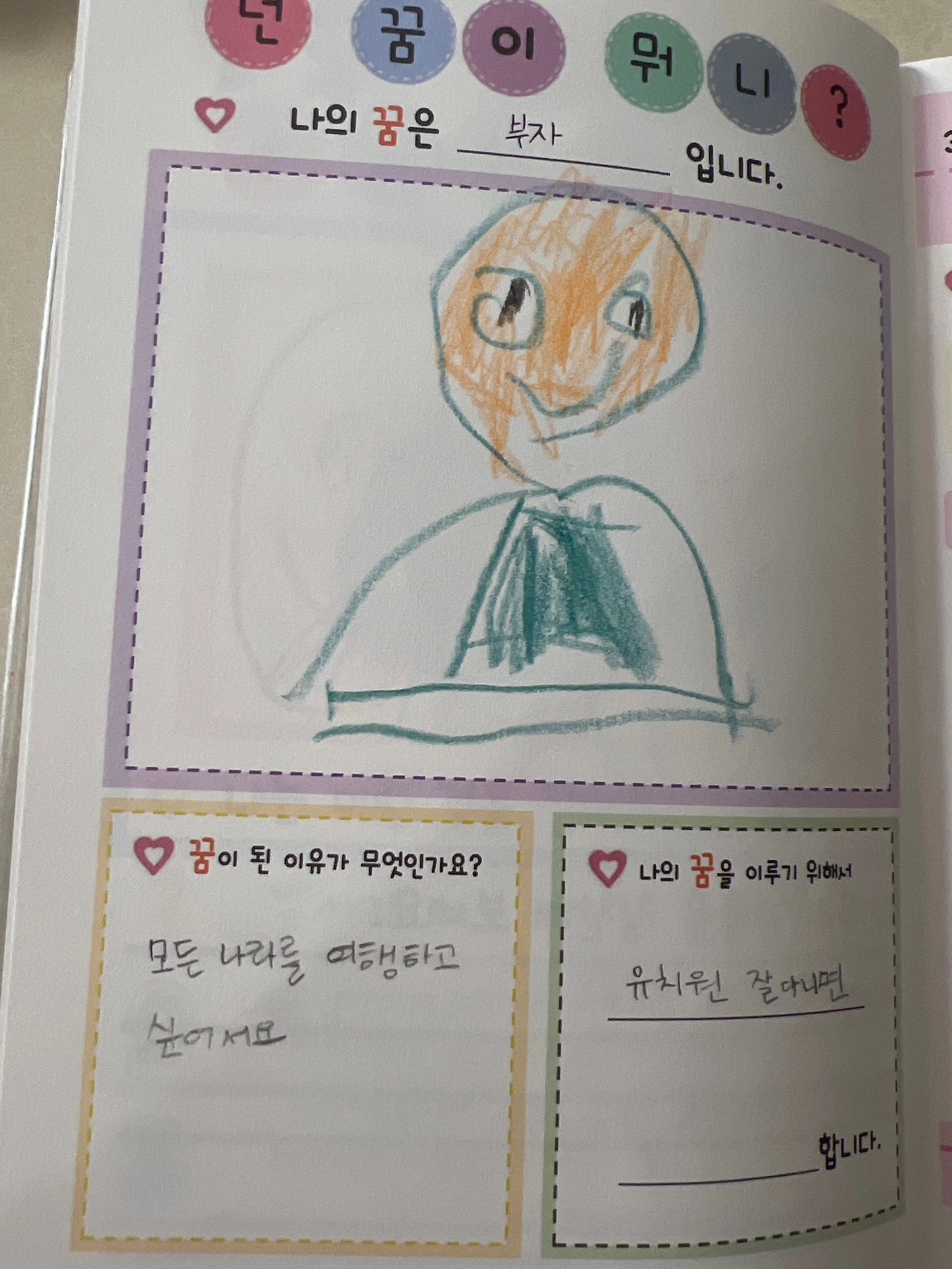 새 학기가 되어 유치원에서 꿈이 뭔지 묻는 질문에 떡하니 ”부자”가 되고 싶다고 써 온 거였다.