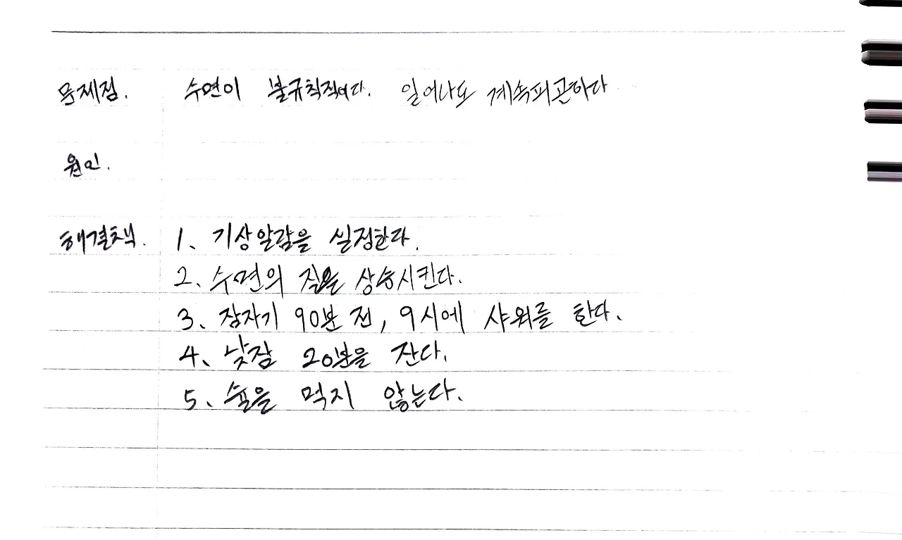 그러나 저는 아주 단순하게 문제를 노트에 적음으로써 문제를 명확하게 인식할 수 있게 되었습니다. 또한 문제를 명확하게 인식하게 되니 그에 대한 해결책도 더 쉽게 나열할 수 있었습니다.