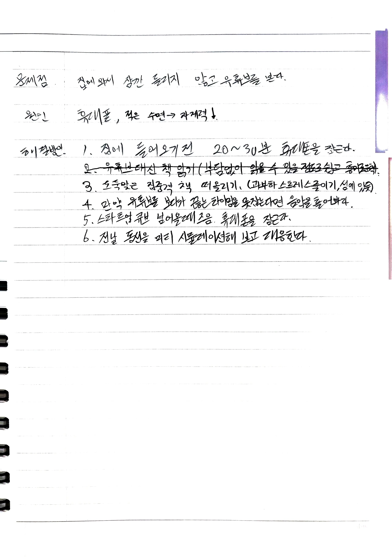 그러한 개선할 점을 매일 밤 자신의 하루를 되돌아보고 더 나은 내일을 위해 바꾸면 좋을 행동을 일기에 적어보시길 추천드립니다. 해결수단은 추상적인 의지보다는 실질적으로 변화할 수 있는 행동이어야 합니다.