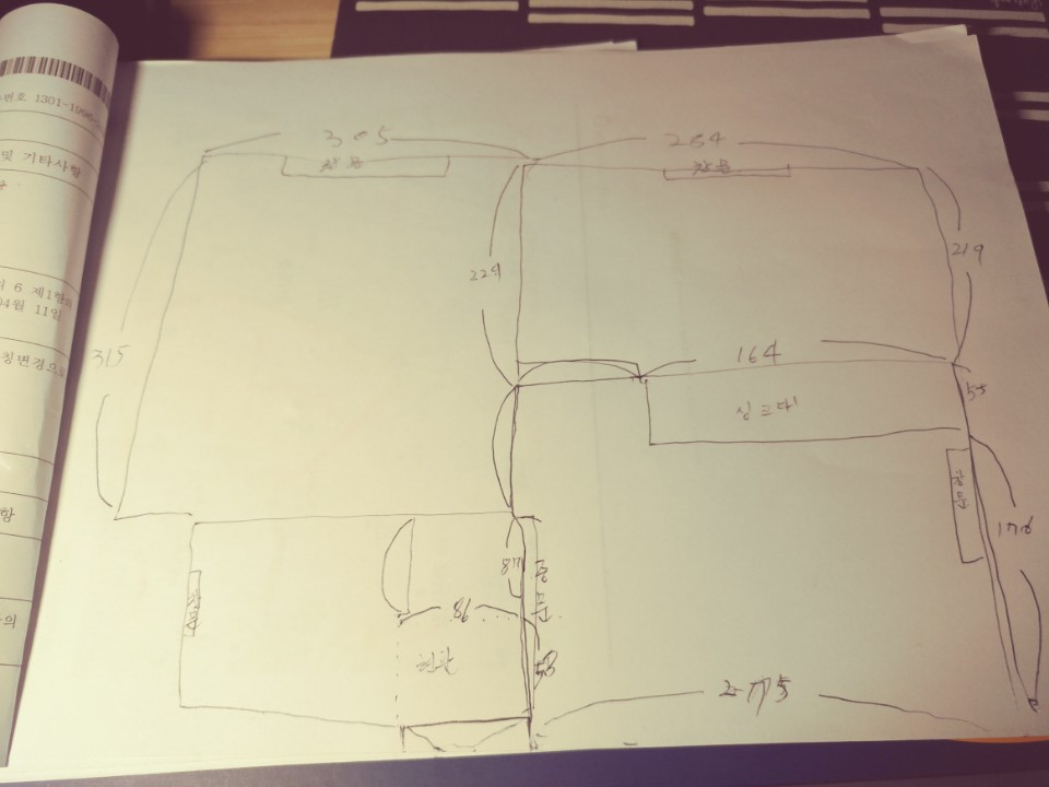 철거 후엔 벽면을 공사했어요. 재료가 얼마나 들지 대략적으로 치수를 재서 평면도를 2분 만에 만들어 봤습니다. 벽공사 하는 과정은 다음에 적도록 할게요.