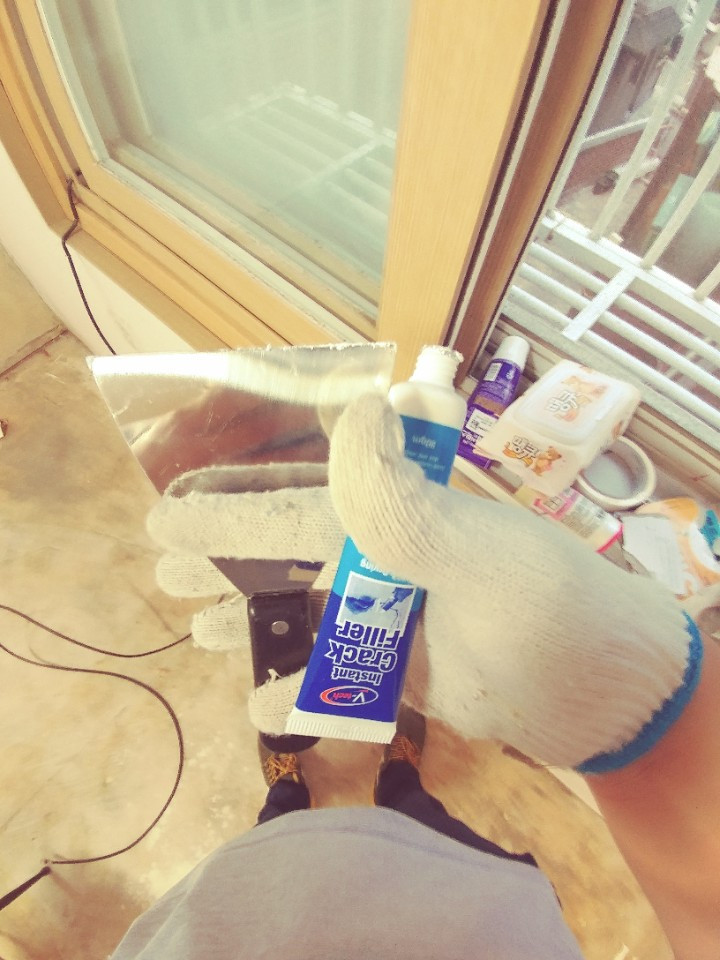 이렇게 해라에 필러를 묻혀 구멍을 막아주면 됩니다. 최대한 깔끔한 벽을 만들어야 페인트칠을 하든 도배를 하든 깔끔하게 나옵니다. 저는 그게 잘 안됐어요. 생각보다 벽지가 깔끔하게 안 뜯어지거든요.