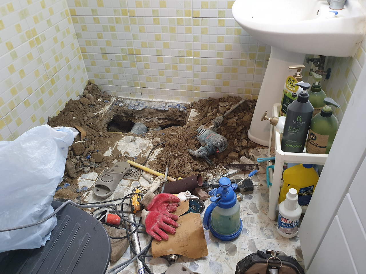 욕실 타일을 다 깨면 저렇게 흙이 나오고 그 흙을 파내면 상수관 하수관이 나온다는 사실을