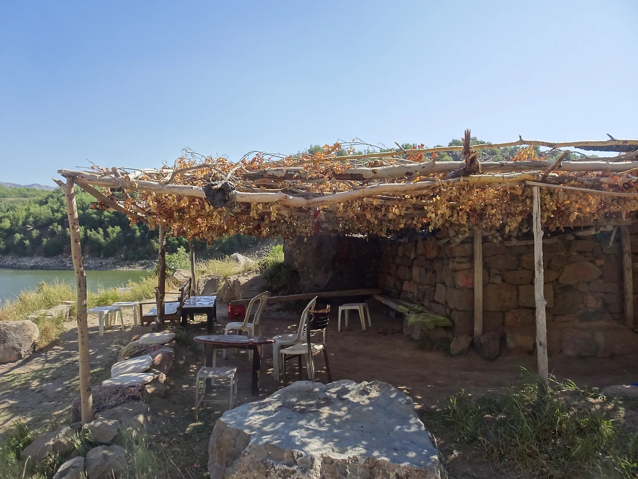집 앞마당에는 가느다란 나뭇가지를 엮어서 만든 덩굴시렁이 있었다. 그곳에는 포도나무 덩굴이 한껏 엉클어져 보기만 해도 시원한 그늘이 드리워져 있었다. 우리는 잠시 쉬다 갈 요량으로 그늘 밑으로 들어갔다. 곧 60대 정도로 보이는 아저씨가 어두운 집 안에서 나왔고 우리에게 차를 대접해 주었다. 내가 아저씨에게 물었다.
