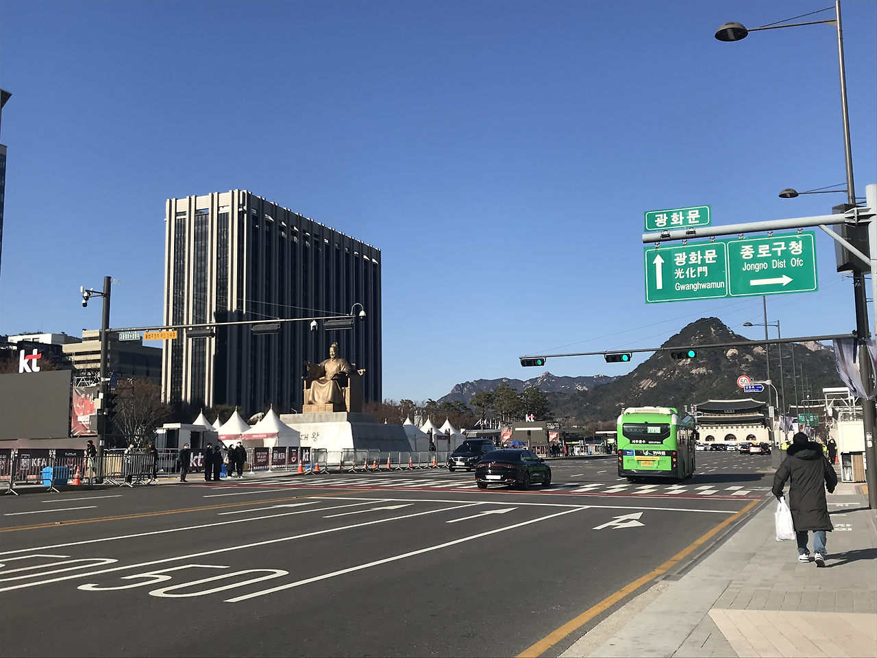 저 멀리 경복궁도 보이고 축구 거리응원하기 위한 장소도 보인다. 오른쪽엔 대한민국 역사박물관, 높은 빌딩의 각종 신문사도 보였다. 신과 구의 조화가 좋다.