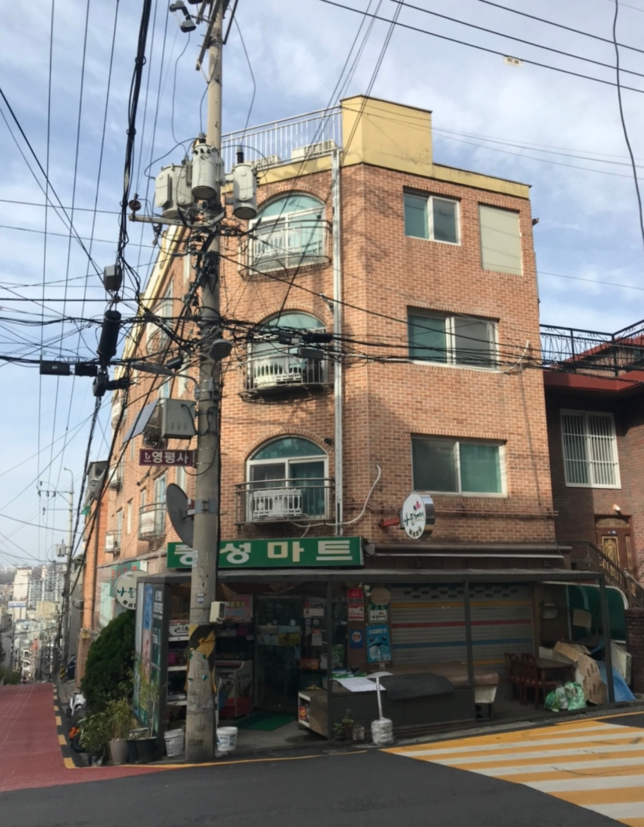 도서관 가는 길, 1시간을 길 위에서 헤맨 듯하다. 전봇대와 이리저리 얽힌 줄, 초록색 간판의 마트와 화초, 주황색 벽돌집의 조화가 예뻤다.