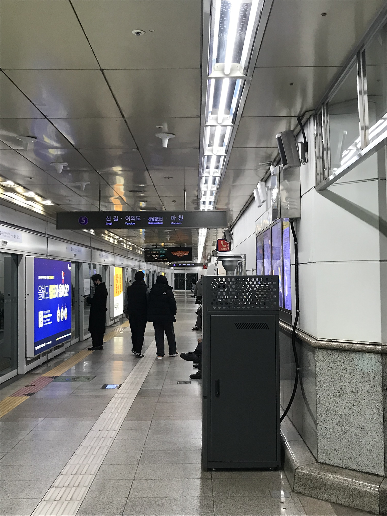 마천행 지하철 탑승 전, 지하철을 기다리는 사람들.