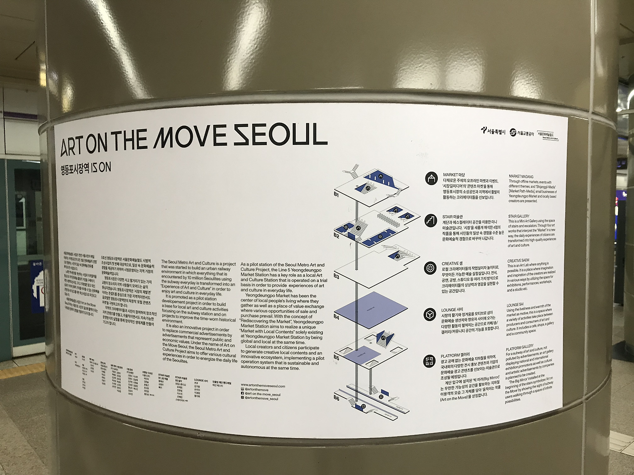 지하철 역 내부로 들어갔더니 art on the move seoul 이라는 타이틀로 프로젝트를 진행하는 것 같았다. 낡고 오래된 역을 시청에서 문화예술공간으로 활용해서 활기를 띄게 하려는 것 같다. 사진은 못 찍었지만 화가 몇 명과 협업해서 '전통시장'을 주제로 역 벽면에 그림을 그려놓기도 했다.
