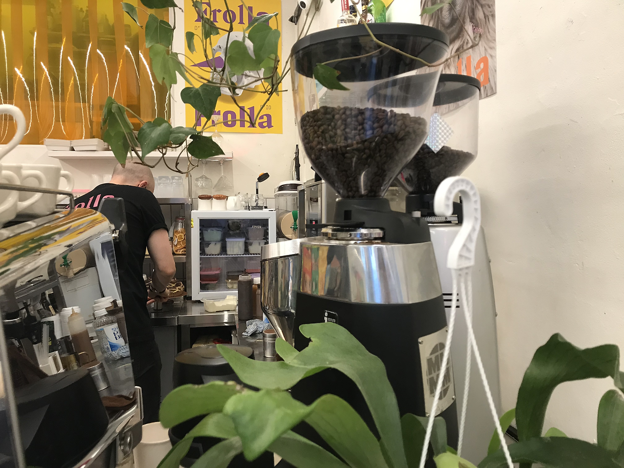 사장님 뒷모습, 벽에 붙어있는 '프롤라' 포스터와 천장에 달려있는 식물들. 자유로운 분위기였고 내부는 좁은 편이었다. 다행히 바석이 있어서 혼자서 편하게 갈 수 있는 분위기인 것 같다.