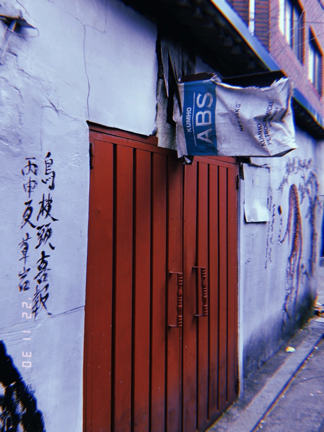 이런 걸 노출 콘크리트라고 하나. 붉은 벽돌과 흰 문, 검은 바닥에 노란색으로 써 있는 글씨가 예뻐서 찍었다.