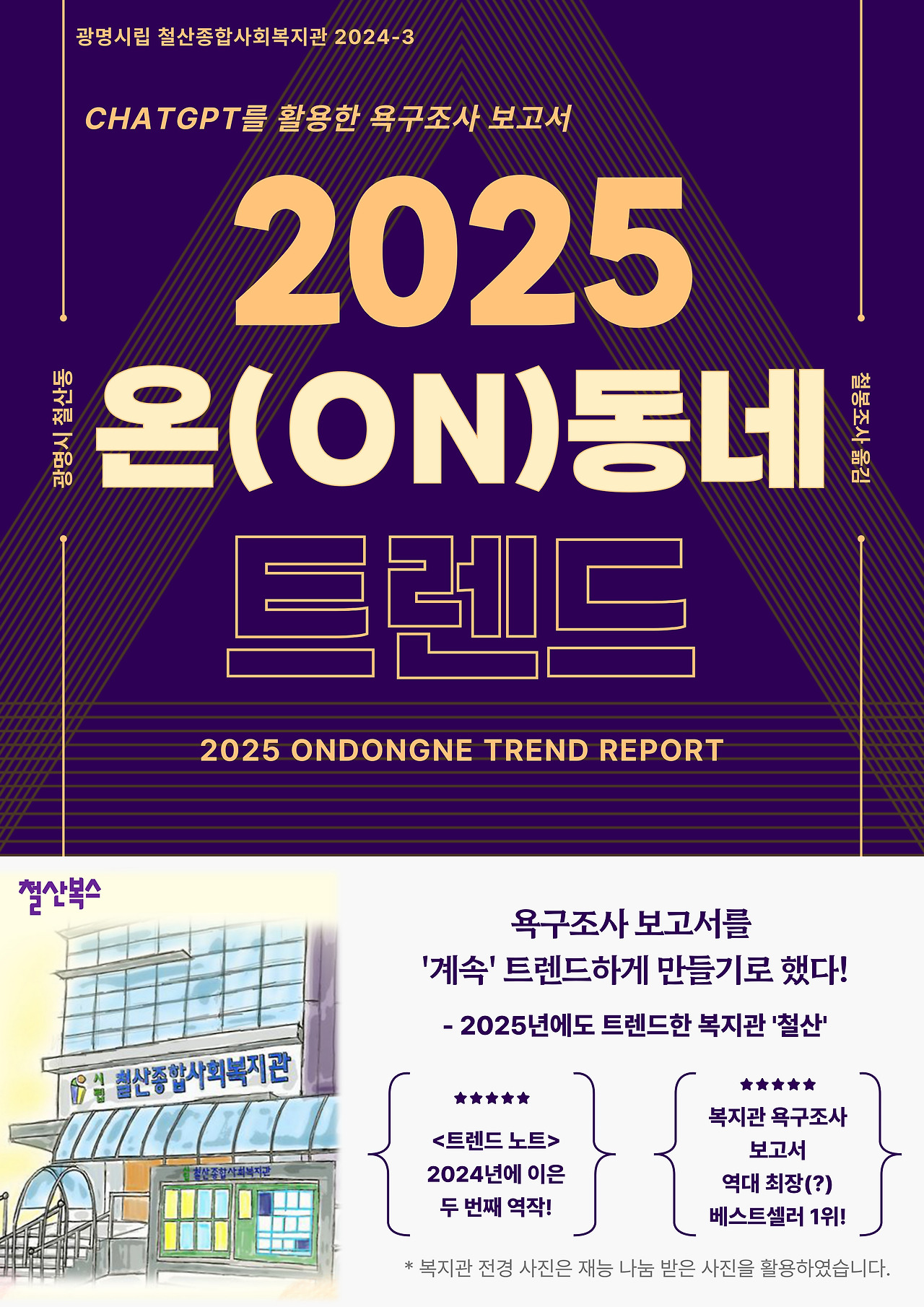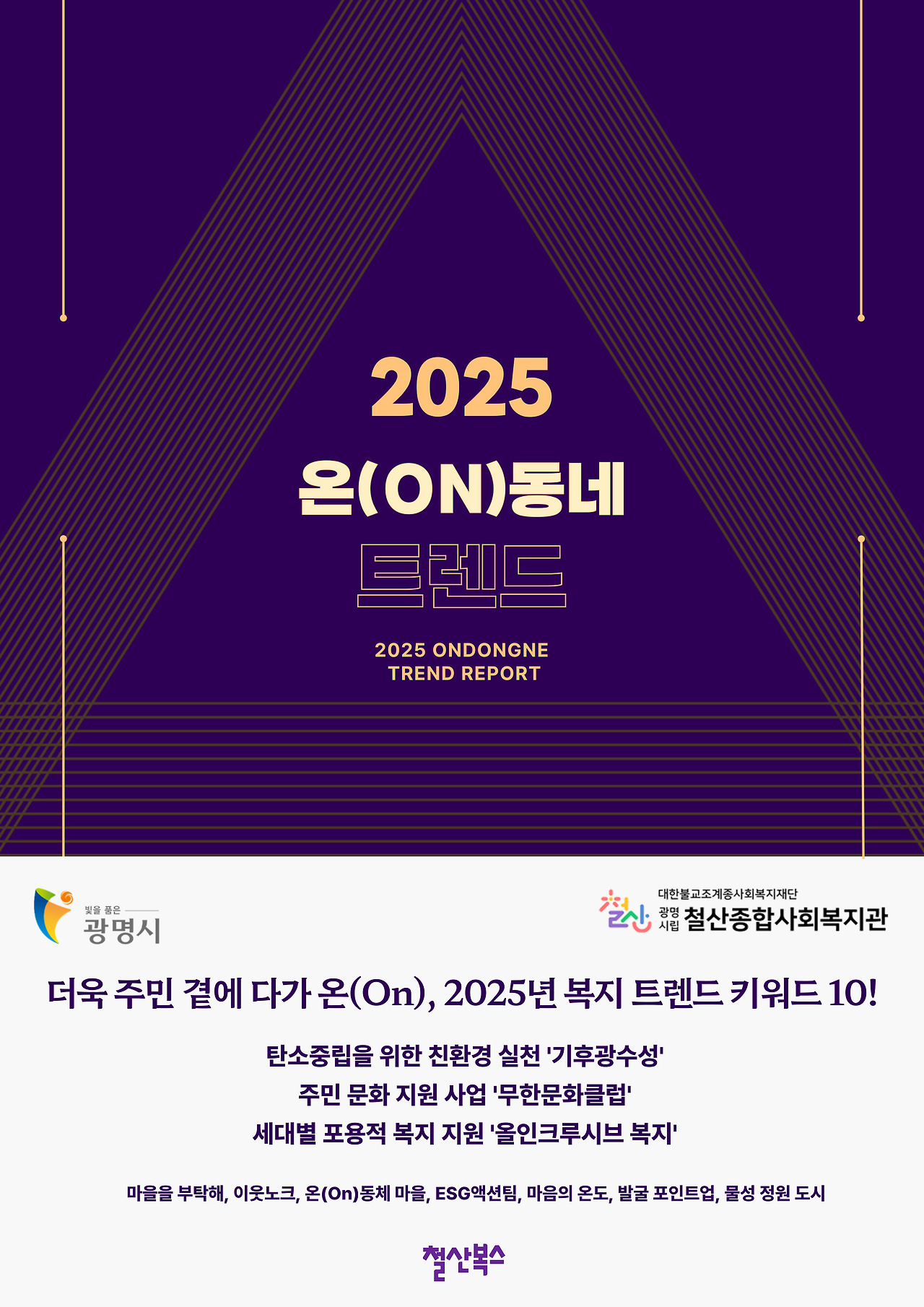 이러한 염원을 담아 2025년의 트렌드 노트는 ‘2025 온(ON) 동네 트렌드’라는 이름으로 더욱 업그레이드되어서 돌아왔다. 그런데 사실 ‘트렌드 노트’라는 이름은 동명의 책이 있다(북스톤 출판사). 그렇기도 하거니와 올해는 광명 지역의 복지 이슈를 담은 새로운 이름으로 변경하였다. 광명시는 2024년부터 서울의 지역밀착형 복지관을 벤치마킹하여 경기도에서 선도적으로 동 중심 실천을 전개하고 있다.