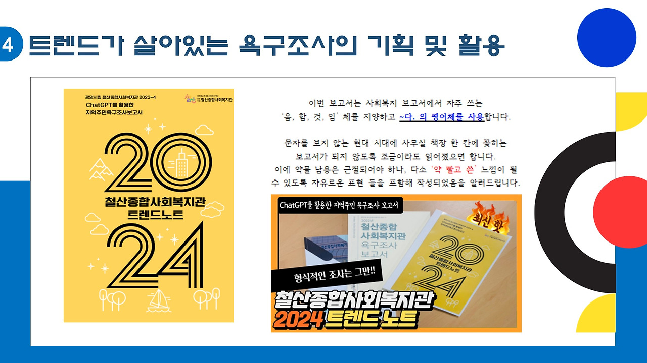 이름은 ‘2024 철산종합사회복지관 트렌드 노트’라고 지었다. 시중에 나온 트렌드 코리아 외 다양한 트렌드 책을 모토로 삼아 복지관 지역주민 욕구조사 보고서를 ‘트렌드’하게 만들었다. 복지는 이슈가 정말 많다. 이를 시중의 책들처럼 키워드화 하여 정리하고 소개하면 복지 현장 실무자들에게 좋을 듯했다. 통계와 어려운 사회복지 용어로만 가득 찬 보고서보다는 사회복지 전공대학생, 혹은 지역주민에게도 잘 와닿을 것 같았다.