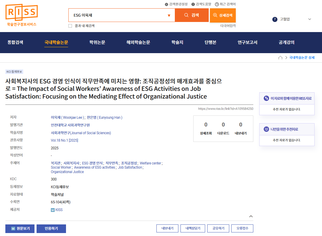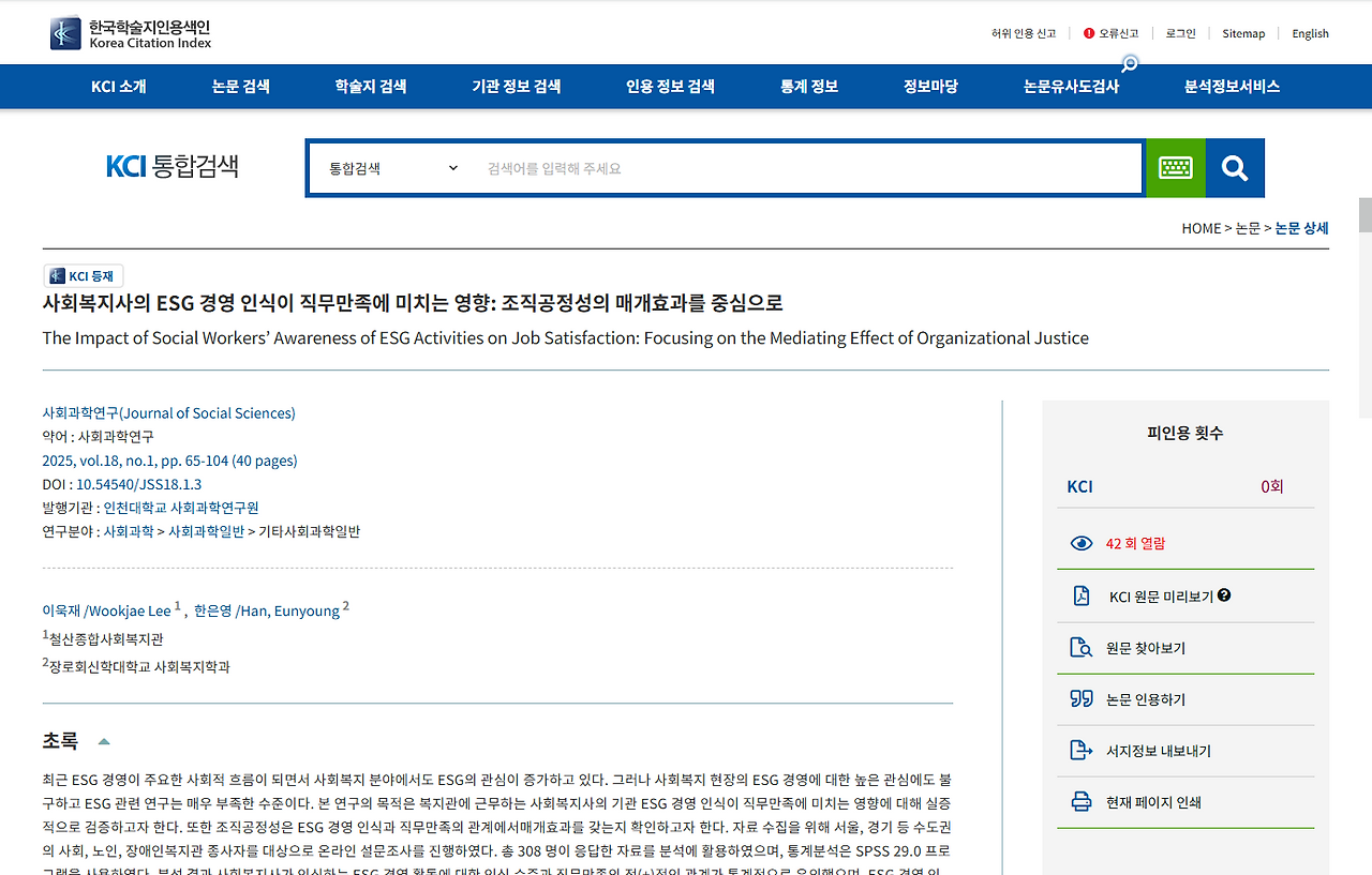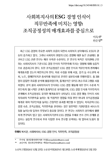 “사회복지사의 ESG 경영 인식이 직무만족에 미치는 영향: 조직공정성의 매개효과를 중심으로”로 입니다. 개인적으로 학위 논문도 아니고, 학술지라서 많이 읽히고 이슈를 던질 수 있도록 약간 후킹과 함께 참신한 느낌을 주고 싶었지만 심사 통과를 위해 개성을 좀 억제한 것이 아쉽네요...