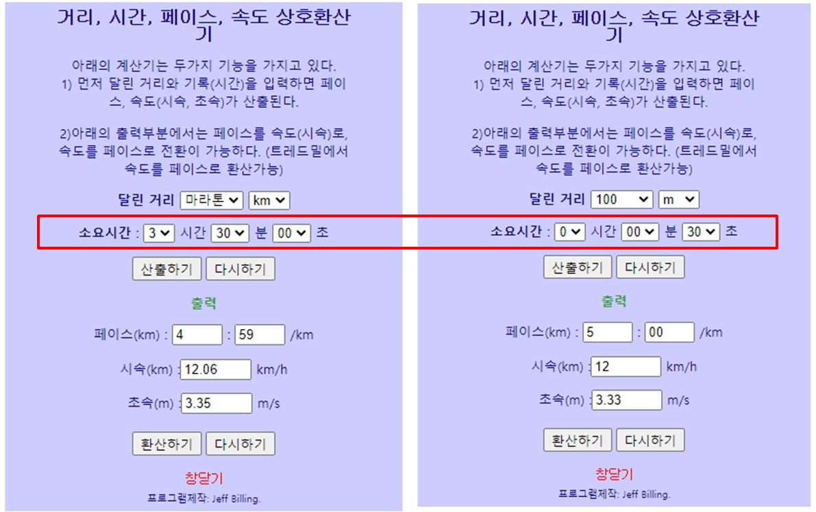속도 환산기(출처: 출처: 마라톤 온라인)