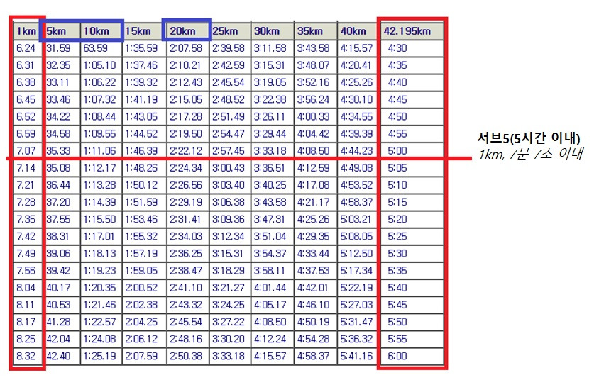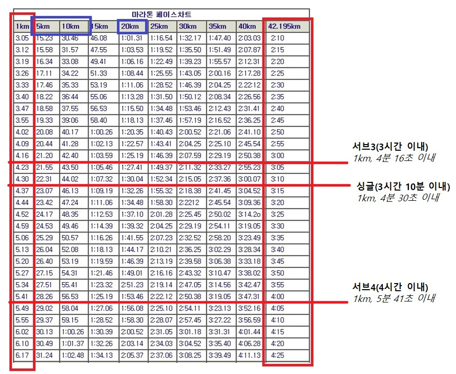 마라톤 페이스 차트표(출처: 마라톤 온라인)