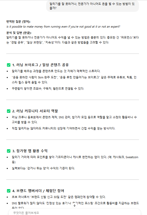 음... 역시나 다양하게 설명을 해 주었으나, 마음에 들지 않는다. 비전문가의 달리기에 대한 내용으로 맞을 수는 있지만, 꼭 달리기에 대한 주제가 아니어도 세상 모든 분야에 해당될만한 답변이다. 그리고 중요한 거는 별로 돈이 안된다... 3번 '앱 활용 수익'은 그나마 내 마음에는 들지만 수익이 적고, 새삼 엄청 새로운 지식이라고는 볼 수 없다. 누구나 다 아는 정보이다. 역시나 실망이다 GPT...