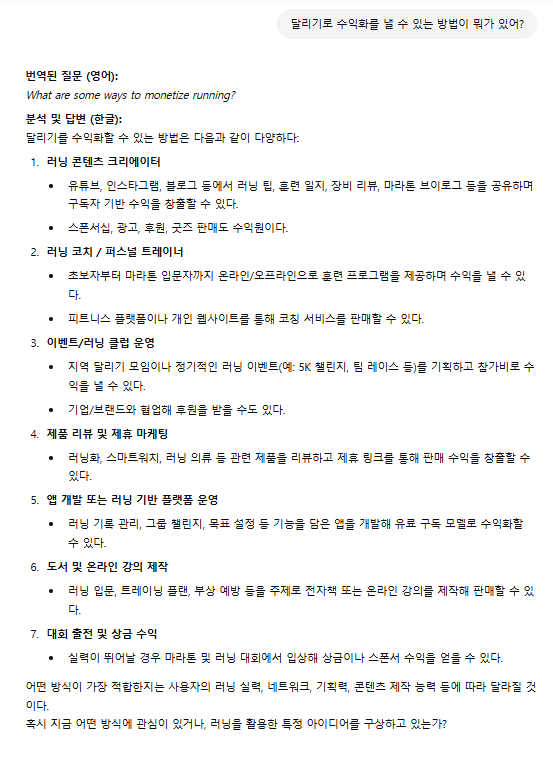 어쨌든 내가 생각하고 있는 달리기에 대한 궁금증을 GPT에게 물어보았다. GPT를 별로 안 좋아하는(?) 나는 무료 버전을 사용하였다. 그 첫 번째 질문은 '달리기 수익화 방법'에 대한 결과물이다.