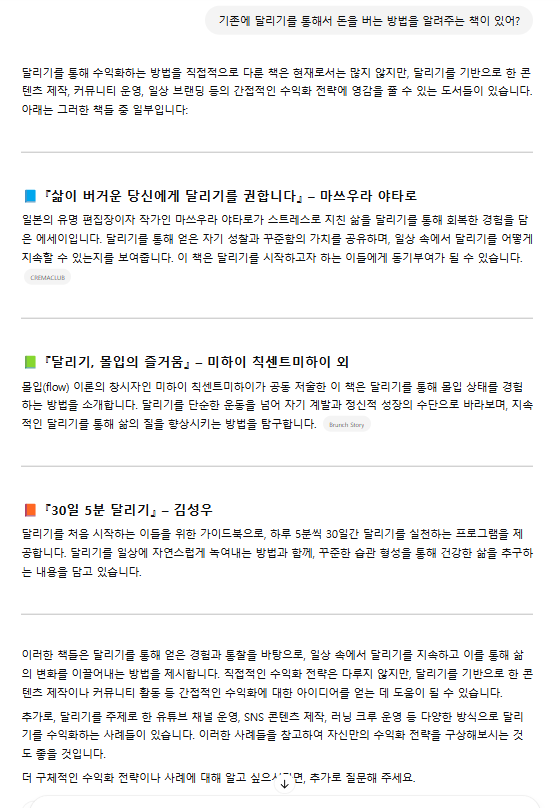 세 번째 질문을 해보았다. 브런치 작가라면 누구나 관심이 있는 '출판' 여부를 물어보았다. 달리기 수익화에 대한 도서가 시중에 나온 게 있을까?
