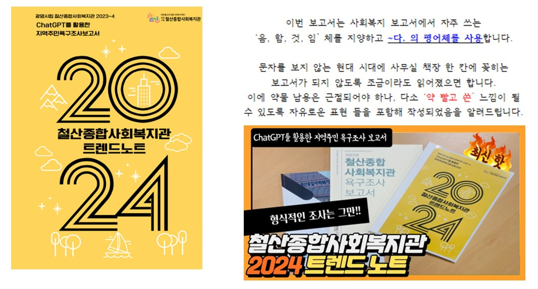 물론 해도 된다. 그러나 챗GPT가 알려준 지식이 우리에게 딱 맞는가? AI가 준 초안을 가지고 우리 스스로 주도적으로 사고하고 우리 기관에 맞는 결과물로 가공할 수 있는 능력이 중요하다. 본질적으로 중요한 것은 사회복지사로서의 주체성과 전문성이다.