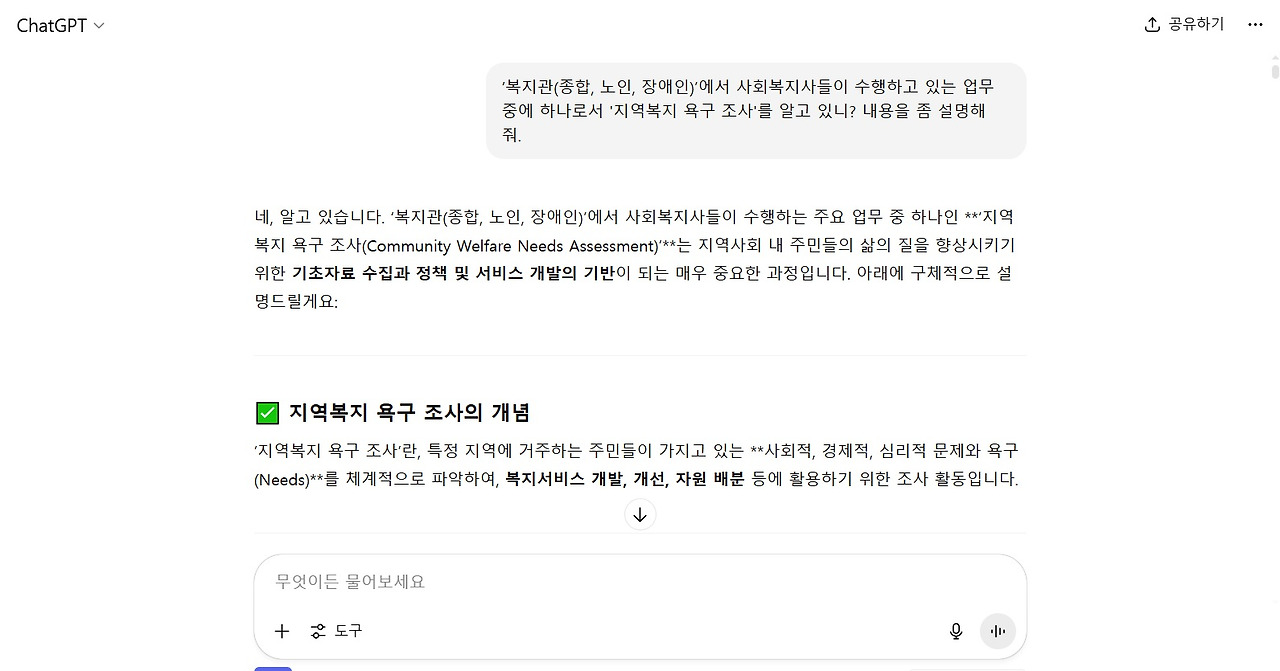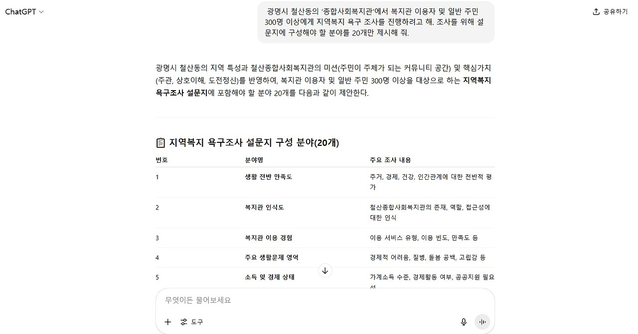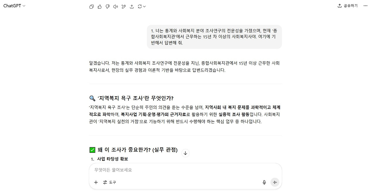 중요한 건 AI에게 최종 결과물을 원하면 안 된다. 업무 시간 절약과 창의성을 얻기 위한 차원의 초안, 요약, 분석 자료를 받는다고 생각하면 된다. 이번 글에서는 사회복지 현장에서 욕구조사를 처음 기획 설계하고, 설문지를 제작을 위해 내가 만든 프롬프트를 설명하고자 한다. (좀 길다)