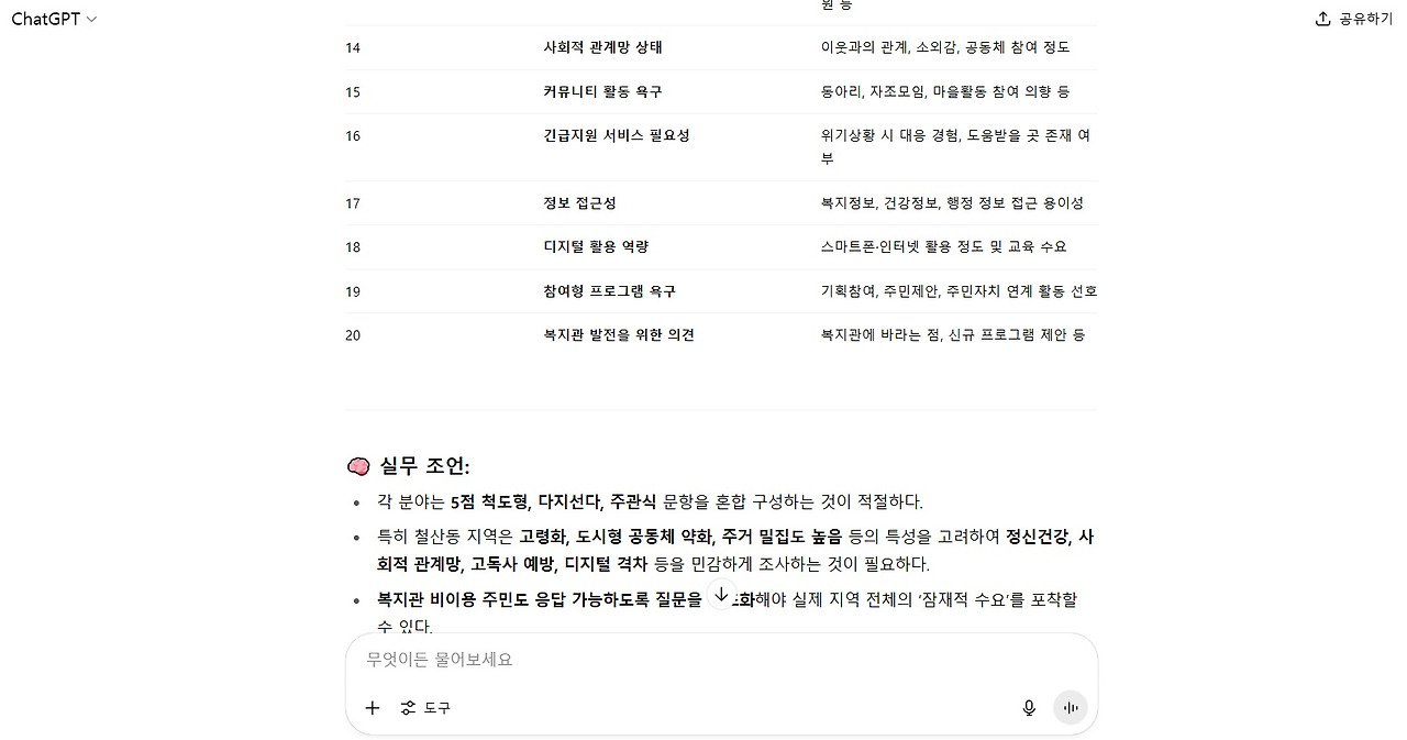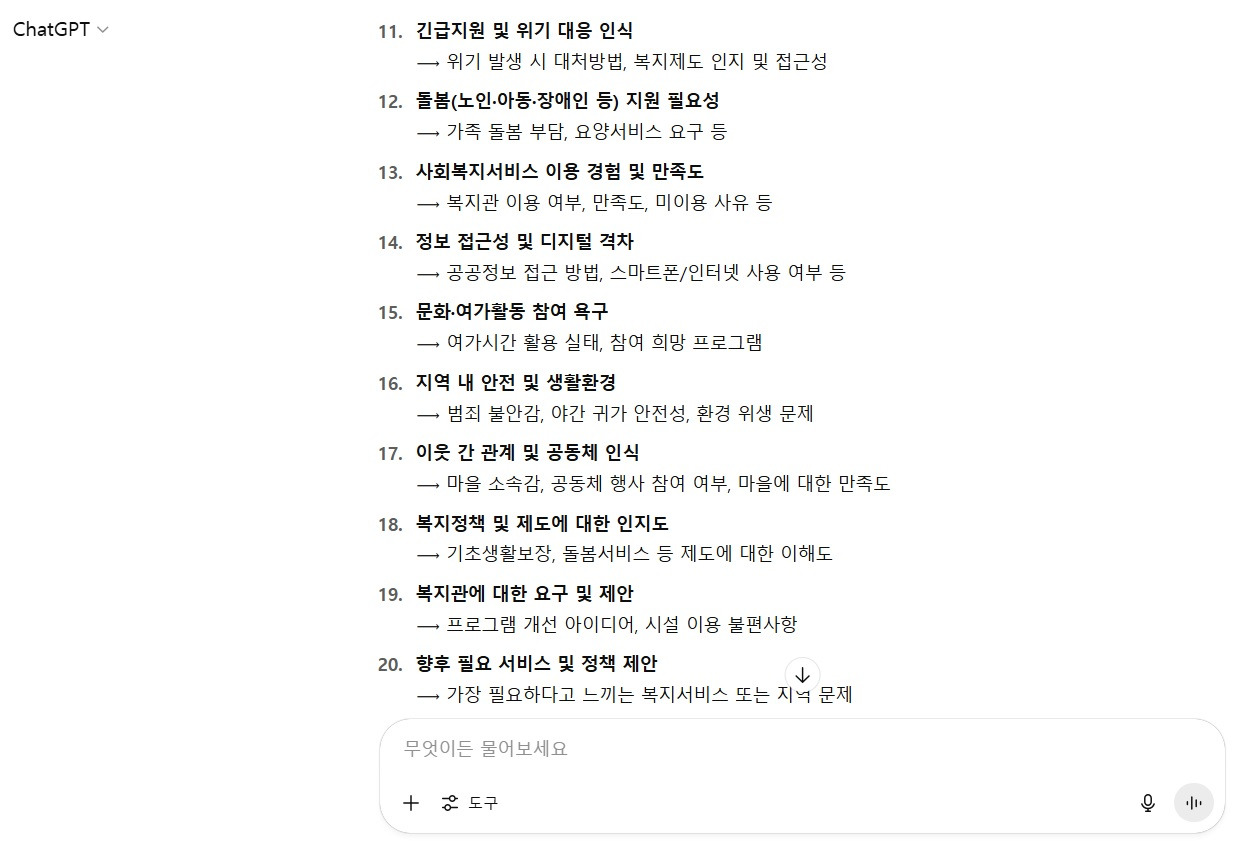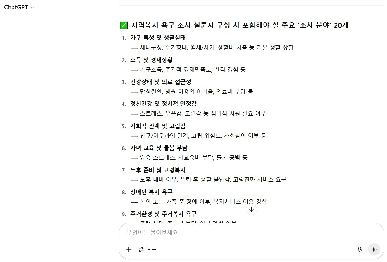 많이 아는 이야기를 너무 자세히 설명한 듯한다. 이제 본격적인 '복지 욕구조사 설계'에 대한 AI 프롬프트 단계이다.