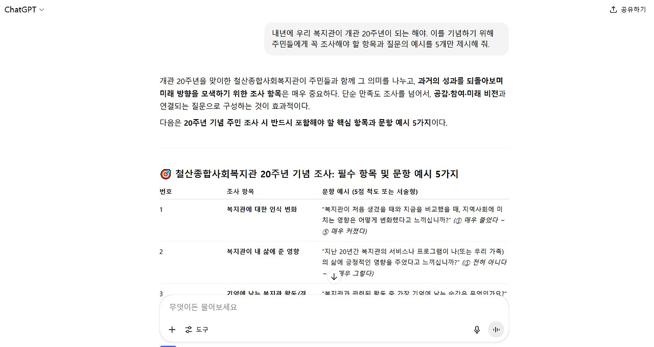 이제 AI가 응답한 항목에서 더 자세히 알아보고 싶은 분야나, 내가 특별히 더 넣고 싶은 항목을 구체적으로 언급하여 질문하면 된다. 예시로 내년도 복지관 개관 20주년에 대한 질문을 해보았다.