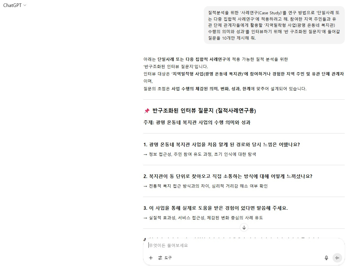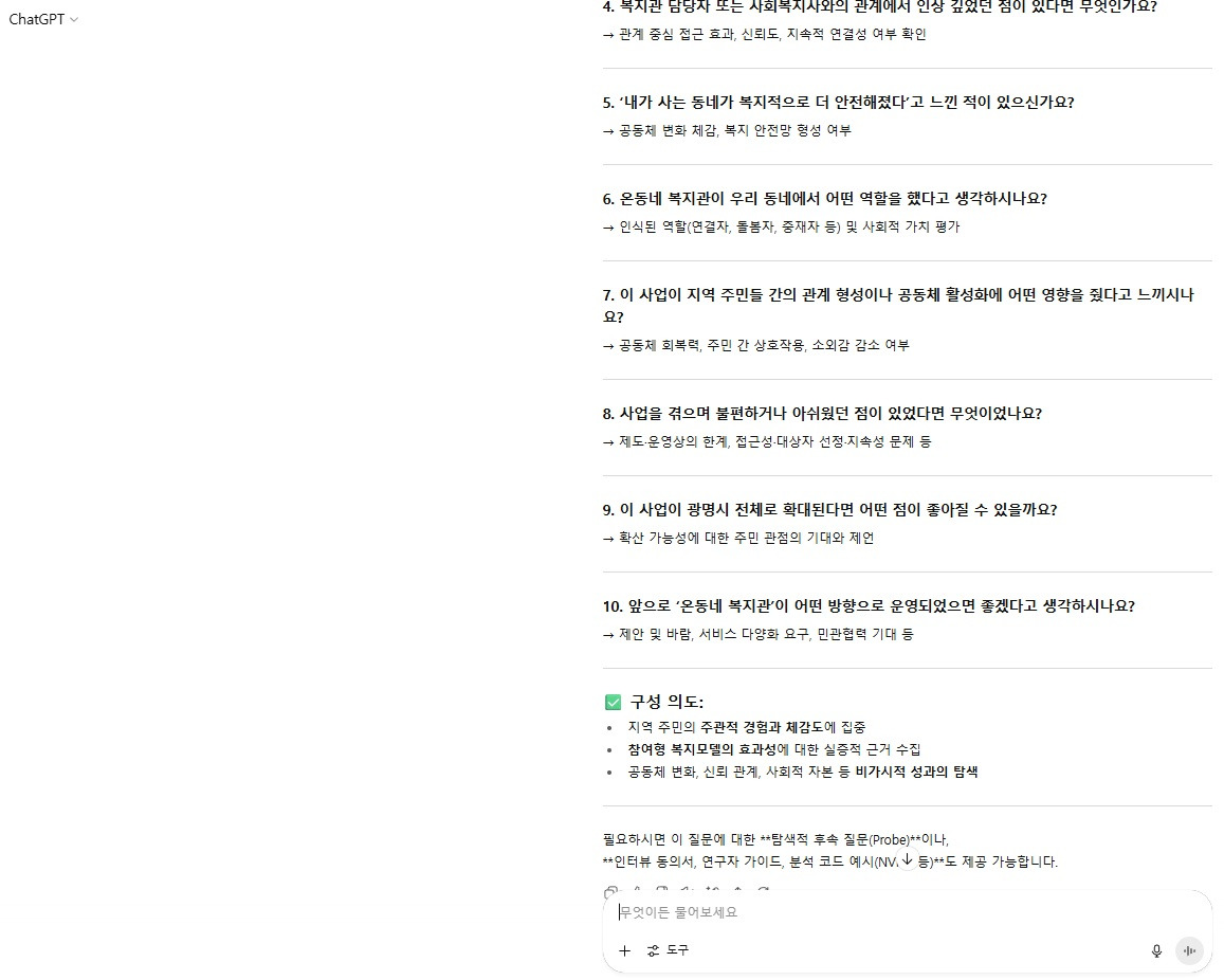 상당히 결과물이 괜찮다. 마음에 안 들면 조금씩 수정하면 된다. 오히려 실제 진행은 어려워도 텍스트는 간결한 질적연구의 질문지가 AI가 더 좋은 작업물을 만든다는 생각이다.