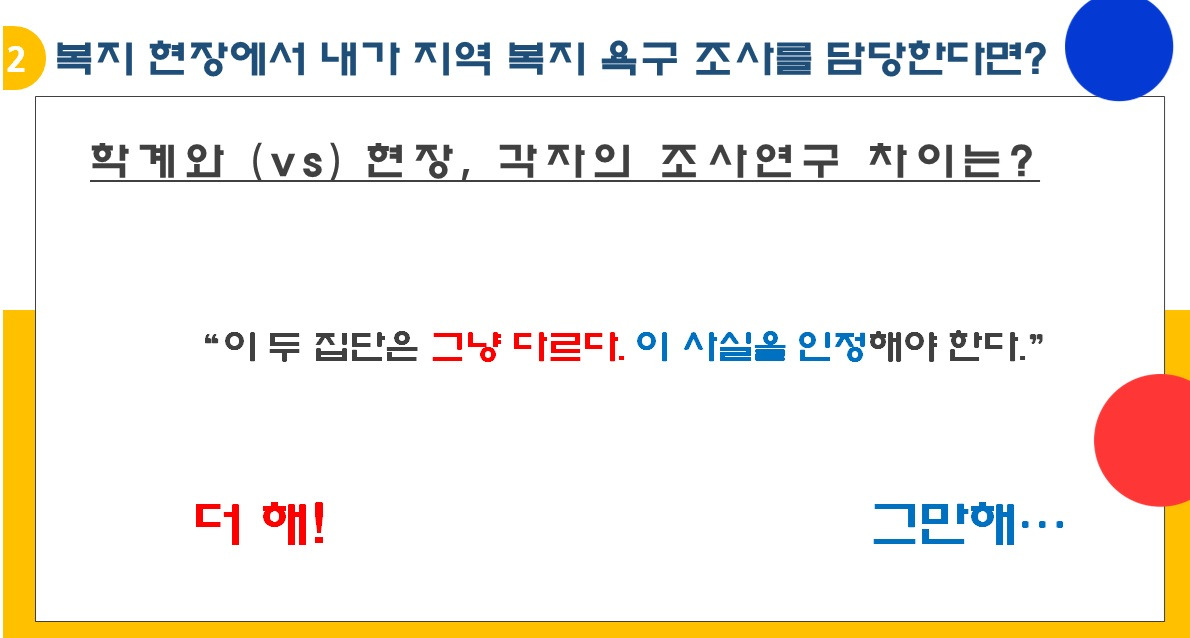 따로 놀아야 한다는 뜻이 절대 아니다. 자주 내가 반복하는 이야기지만, 사회복지는 사회과학에서 파생된 응용학문으로서 연구와 실천이 함께 이루어짐이 무엇보다 중요하다. 다르다는 건 특히 연구의 측면인데, 대표적인 행동의 차이가 있다. 학계는 '더 해', 현장은 '그만해'를 외친다. 당연히 주 업무가 실천인 현장은 연구를 후차적인 문제로 볼 수밖에 없다. 그렇다는 건 결국, 현장의 연구는 '낮은 관심도'와 '적당한 타협'의 문제로서 이어진다.