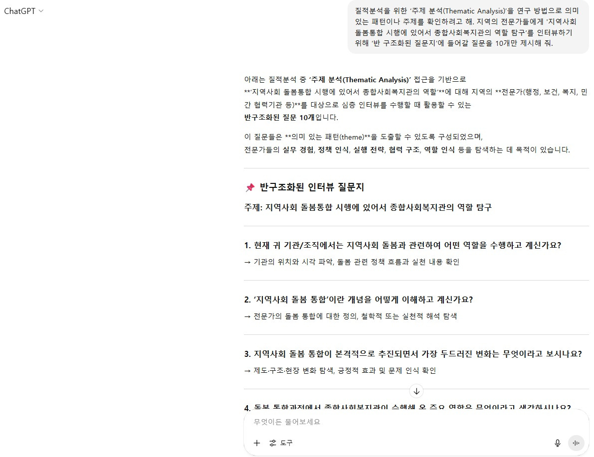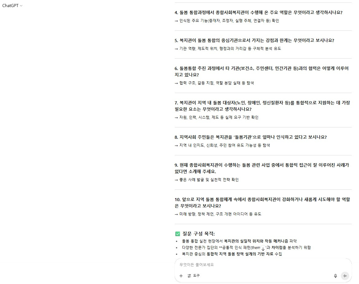현장에서 질적 연구를 한다면 쉽고, 효율적으로 가야 한다. 그러면 뭐다? AI의 도움을 빌려야 한다. 사실 개인적인 생각으로 인공지능은 설문지보다 더욱 직관적으로 질적연구 인터뷰를 잘 뽑아낸다는 생각이 들었다. '상담 혹은 인터뷰를 위한 질문지'를 요구하면 된다. 아주 기가 막힌다.