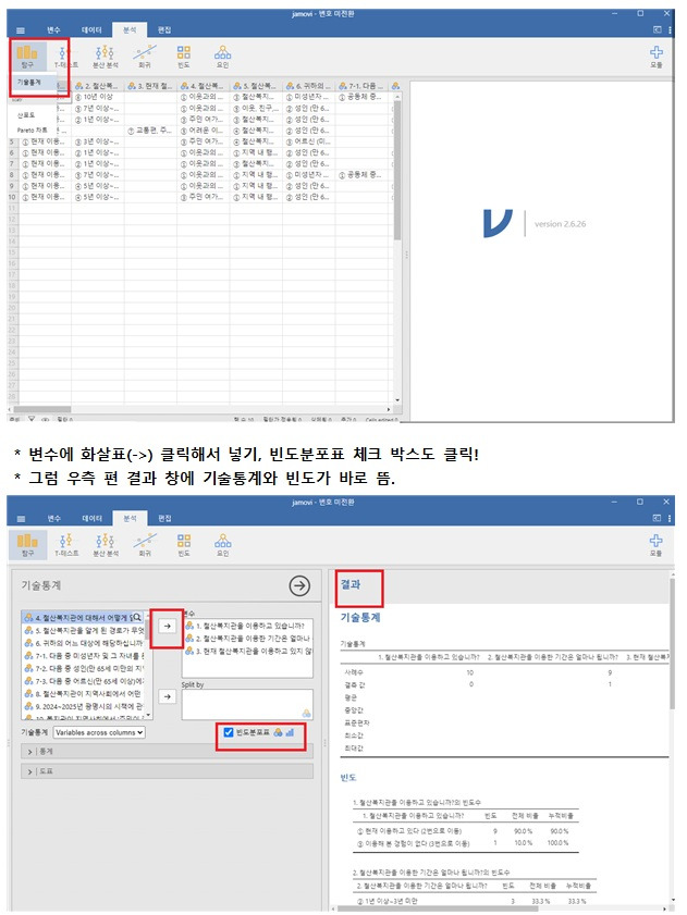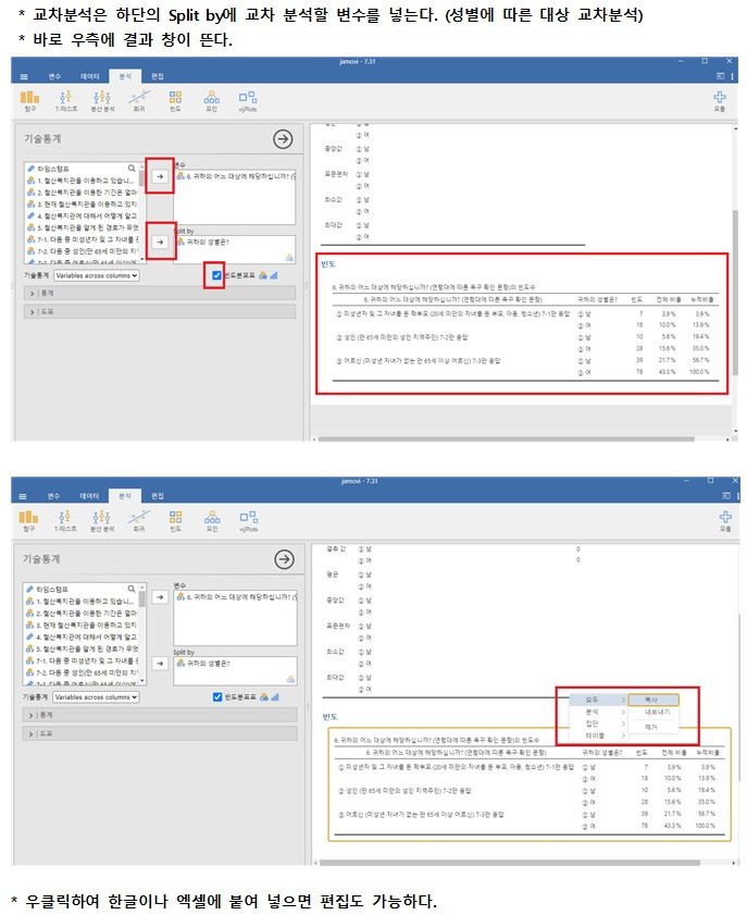 셋째는, 빈도, 교차분석 방법이다. 붉은 박스 창과 설명을 참고하면 된다.