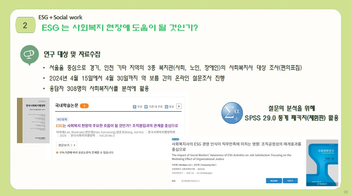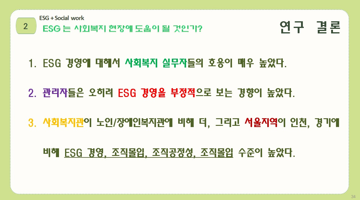 내가 한 연구와 발표는 이 질문에 답을 하는 과정이었다. 조사와 실천을 통해 이야기할 수 있는 건, ESG를 실천하는 복지관 직원들은 더 열심히 오래 일하고 싶다는 의식을 가졌다는 지점이다. ESG가 복지 조직의 종사자에게 매우 긍정적인 영향을 미친다는 것이 통게적으로 검증되었다.