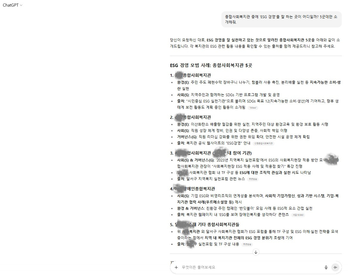 무더운 여름이 오기 전, 봄으로 기억한다. 우리 직원이 나한테 와서 이상하다고 이야기했다. ESG 우수 사례에 대한 온라인 교육을 듣는데, 우리 기관이 나오지 않는다는 거다. 정확히는 작년에 우리가 ESG 전국 대상을 수상했는데, 'ChatGPT'로 "ESG를 잘하는 복지관을 소개해줘"라는 응답에 우리가 아예 언급되지도 않는다는 거였다.