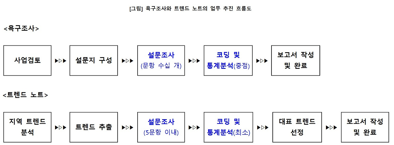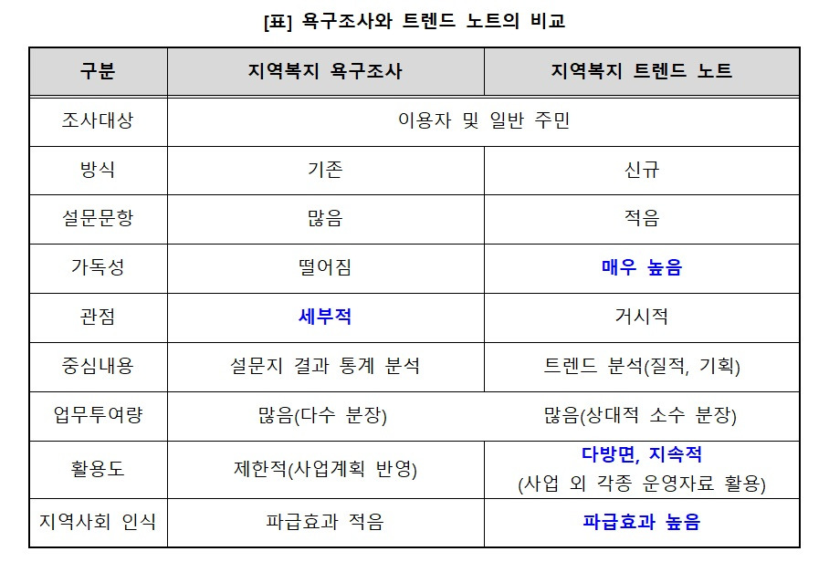 트렌드 노트도 이용자 및 주민을 대상으로 설문한다는 점은 기존의 욕구조사 방식과는 같지만, 설문문항이 획기적으로 적다. 이미 지역에서 검증되고 알려진 지역의 추세와 트렌드를 토대로 그 내용을 정리하는 것이기 때문에 이미 검증이 되고, 다방면으로 지속적으로 활용될 수 있다.