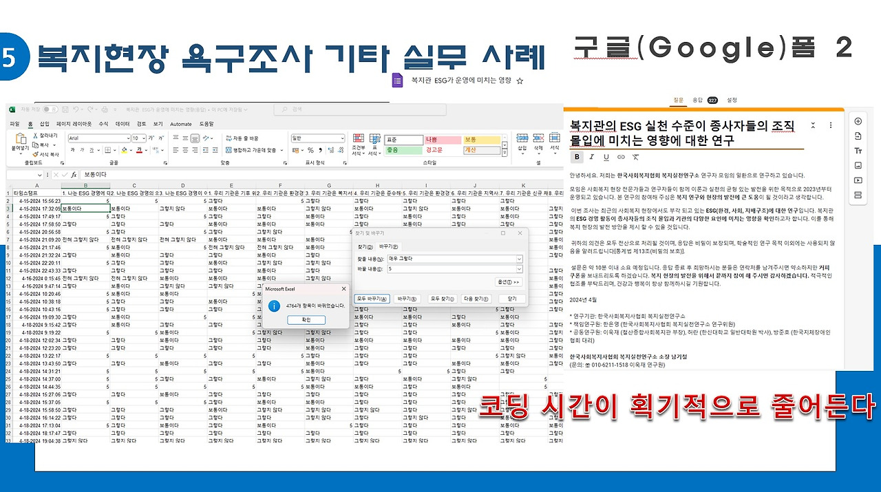 2단계는 코딩이다. 설문의 응답을 부호화로서 입력해서 통계처리 하는 방식을 일컫는다. 수기로 할 때에는 시간 소요가 어마어마했지만, 옛날 일이다. 이제는 온라인을 활용하여 엑셀 다운로드하고, 바꾸기 해버리면 5분, 10분이면 끝난다. 정확도나 시간절약이 전통적인 방식과는 차원이 다르게 좋아졌다. 역시 세상에 패배하지 않으려면 기술을 활용해야 한다.