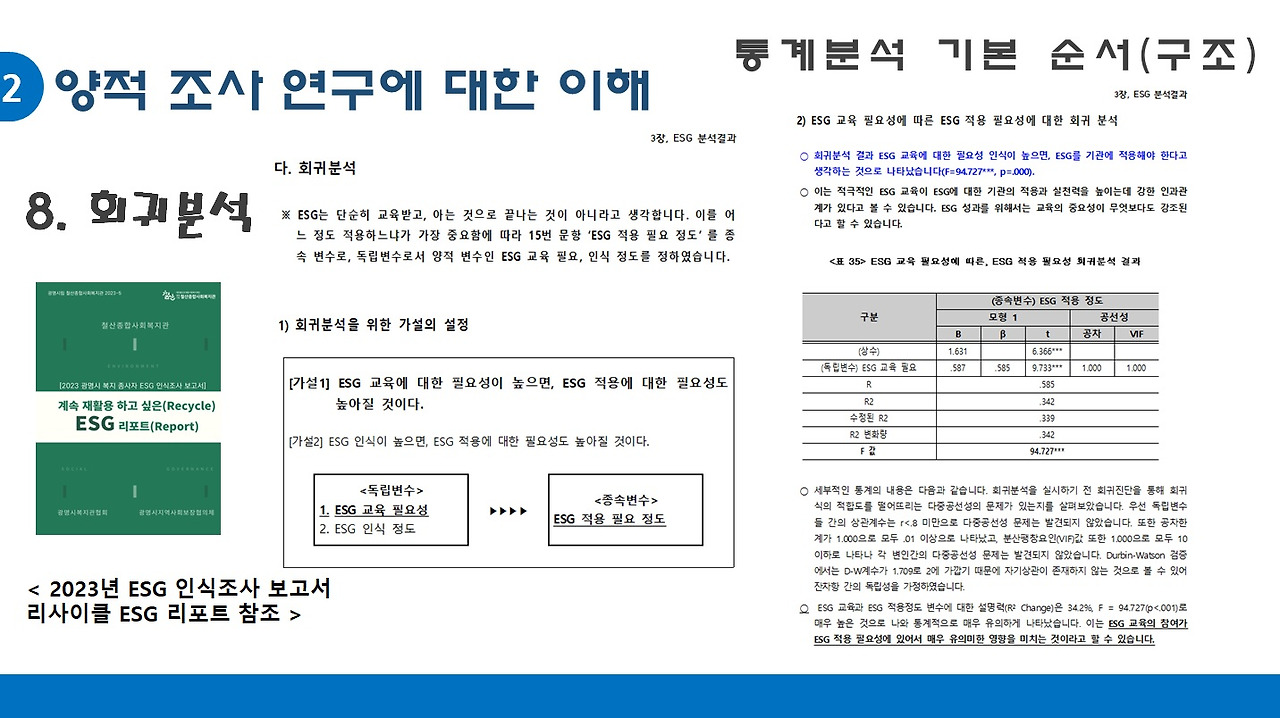 이 회귀분석은 모든 연구 논문의 기준이자 핵심이다. 여기서 완성되고 여기서 확대된다. 인과관계를 나타내는 것으로 연구 가설을 만들 수 있고 '이것(독립변수)으로 저것(종속변수)이 변한다.' 예시를 바꾸자면, '교육의지(척도)는 직무성과(척도)를 높여줄 것이다.'가 되는 것이다. 참고로 두 독립변수와 종속변수는 단순한 명목이나, 서열 척도 1개의 질문이 아닌 다문장의 척도로서 비교되는 것이 논문의 기준이다. 정말이지 통계는 한 개로 판단하지 않고 여러 개를 모아서 본다.