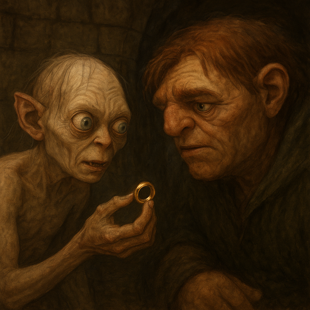 골룸이 콰지모도를 만나 절대반지를 건네주며 속삭인다.