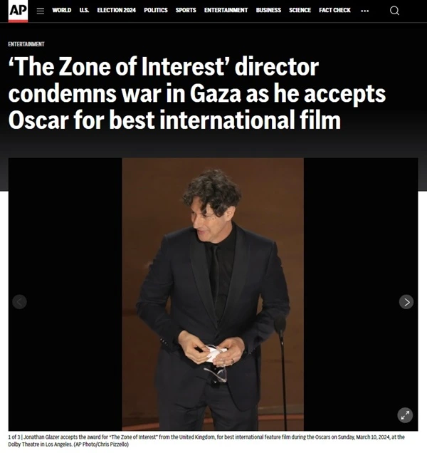 이런 비슷한 상황이 최근 아카데미 시상식에 있었습니다. The Zone of Interest 의 글레이저 감독은 아카데미상 수상 소감으로 이스라엘의 전쟁 책임을 언급합니다. 홀로코스트 관련 영화를 만들어 상을 받는데 그 유대인들이 가자지구에서 다시 학살을 자행하고 있는 아이러니한 상황이 연출되고 있는 현시점을 수상하는 자리에서 용기 있게 말합니다.